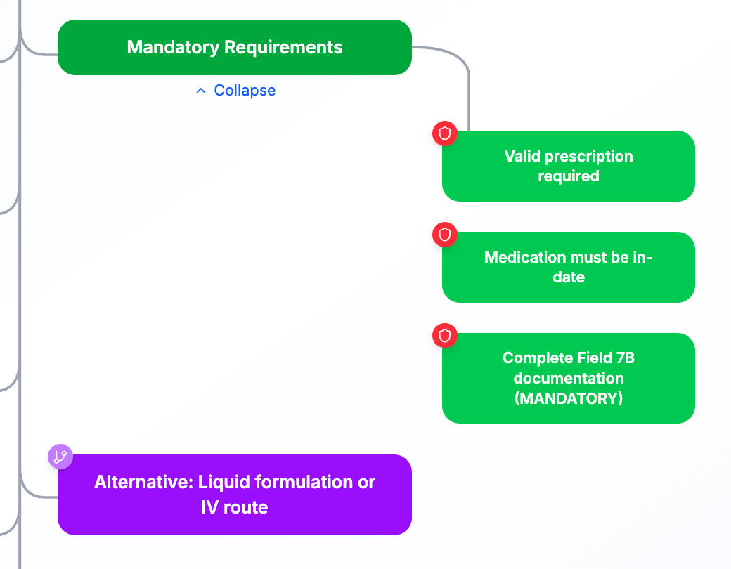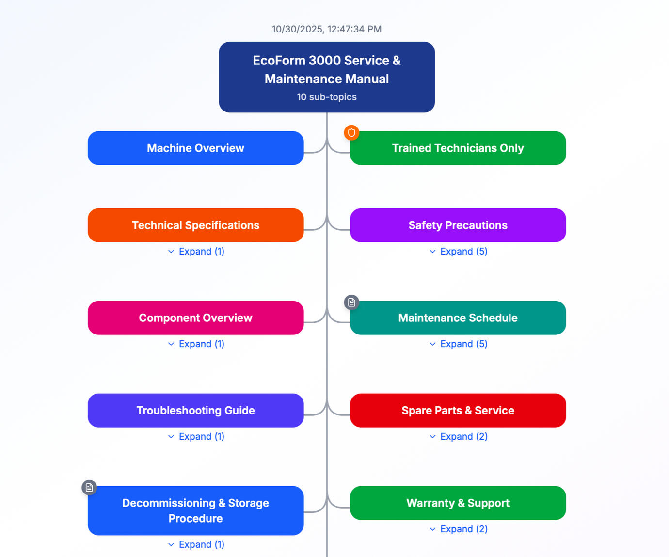 Every node is color-coded by importance and type. Red warnings, green actions, purple key points. Your team knows exactly where to focus attention.